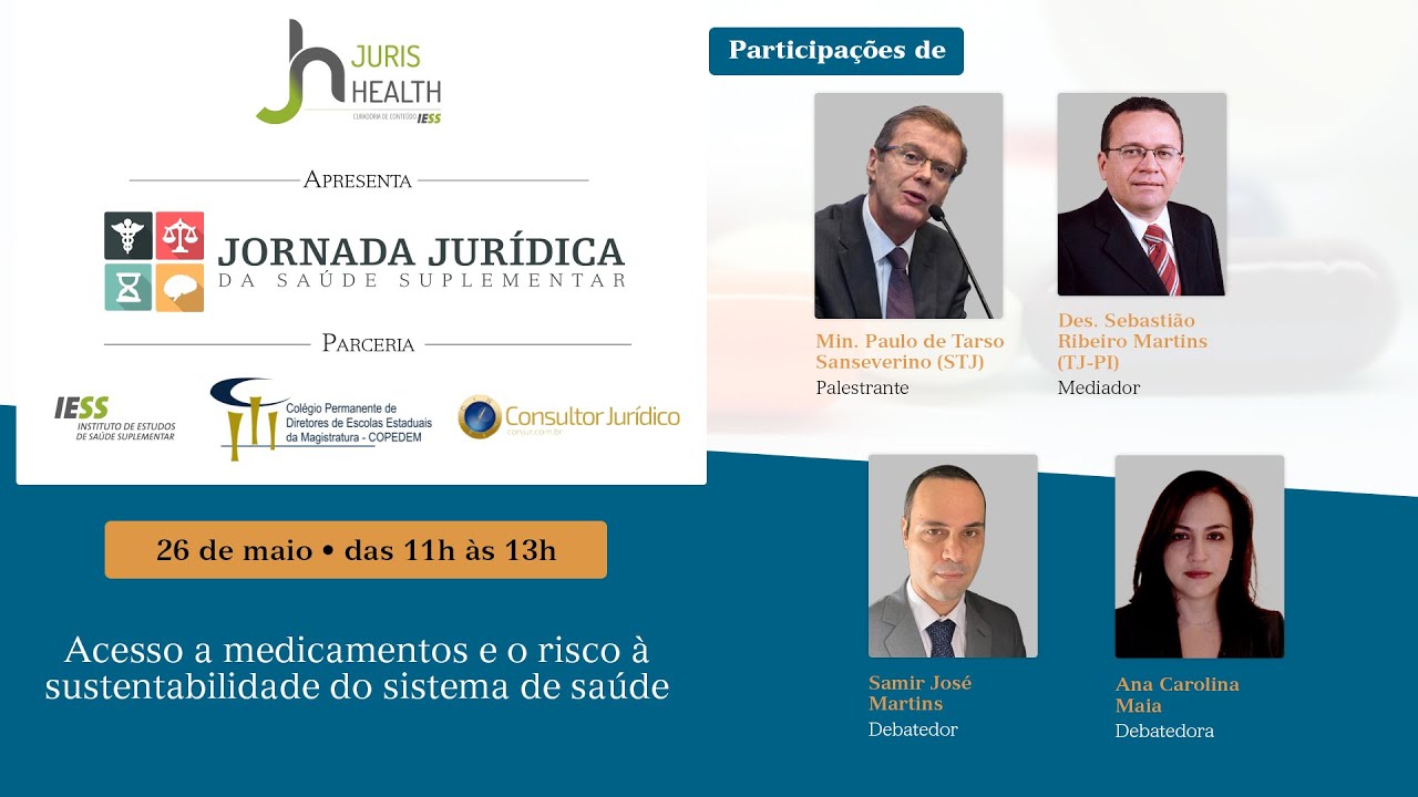 O Instituto de Estudos de Saúde Suplementar (IESS), o Colégio Permanente de Diretores de Escolas de Magistratura (Copedem) e o portal Consultor Jurídico (Conjur) realizam mais uma Jornada Jurídica da Saúde Suplementar. O tema do novo encontro, que acontece hoje (26), a partir das 11h, é o “Acesso a medicamentos e o risco à sustentabilidade do sistema de saúde”.