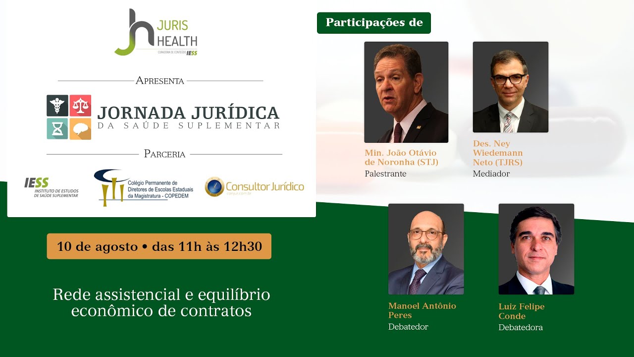 O Instituto de Estudos de Saúde Suplementar (IESS), o Colégio Permanente de Diretores de Escolas de Magistratura (Copedem) e o portal Consultor Jurídico (Conjur) realizam mais uma Jornada Jurídica da Saúde Suplementar. O tema do novo encontro, que acontece hoje (10), das 11h às 12h30, é: “Sustentabilidade na Saúde Suplementar: Rede assistencial e equilíbrio econômico de contratos”.