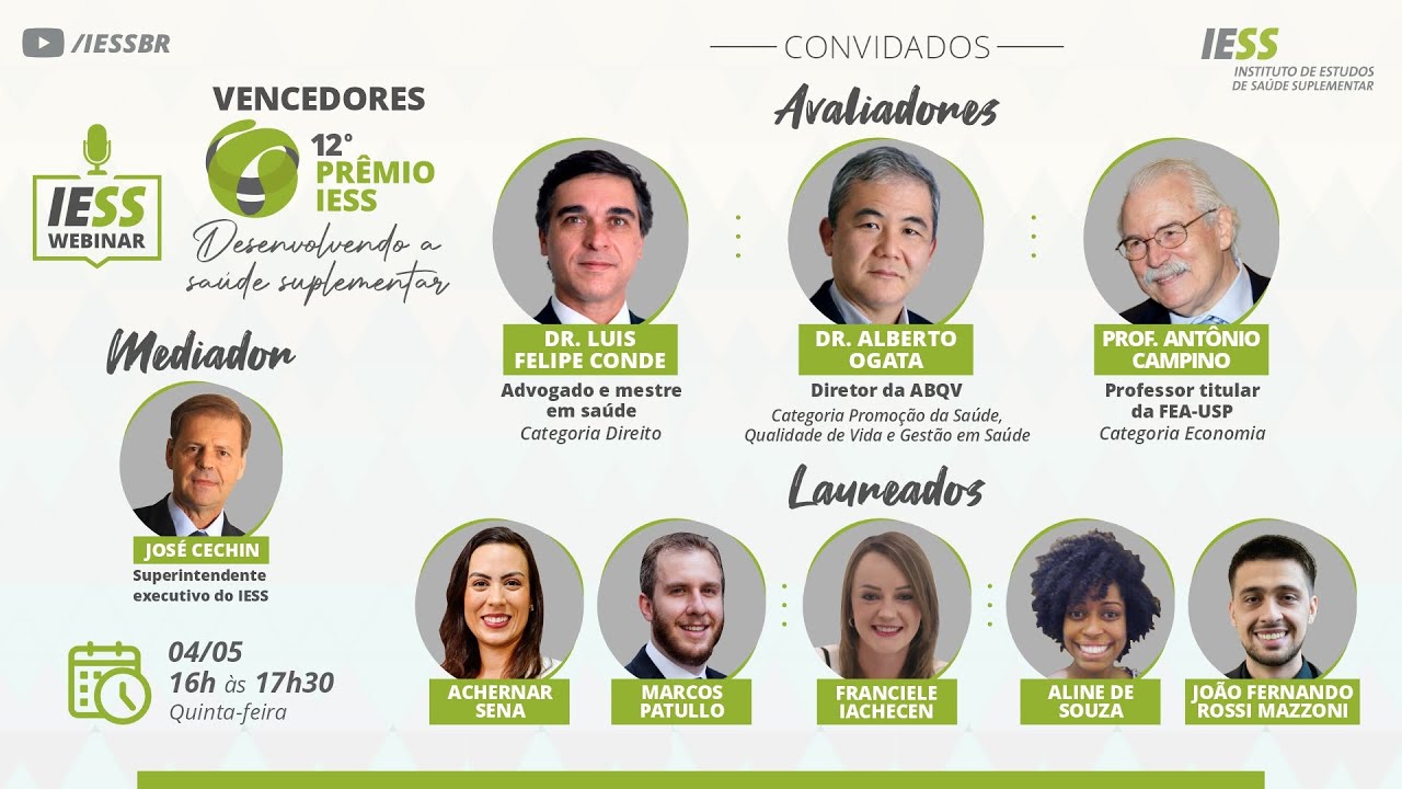 Mediado por José Cechin, superintendente executivo do IESS, o evento terá como tema “Vencedores 12° Prêmio IESS: Desenvolvendo a Saúde Suplementar”. Durante o webinar, os vencedores apresentarão os seus trabalhos e debaterão com os avaliadores sobre a importância da produção acadêmica para o aprimoramento e sustentabilidade do setor e sobre os pilares da saúde suplementar (saúde, economia e direito).