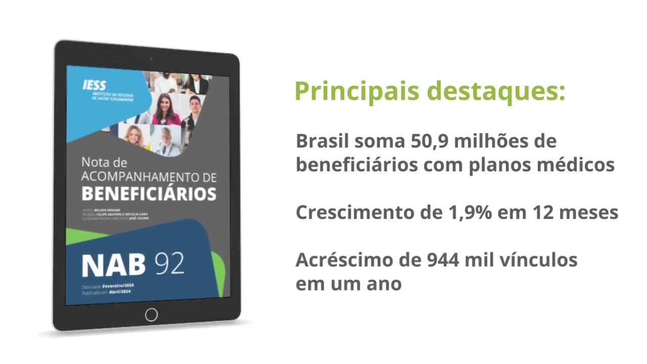 A Nota de Acompanhamento de Beneficiários (NAB) n° 93 do IESS já está disponível com as atualizações dos dados da saúde suplementar até março de 2024. O estudo aponta que os planos de saúde médico-hospitalares fecharam o período de 12 meses com variação positiva de 1,7% e registro de 51 milhões de beneficiários.