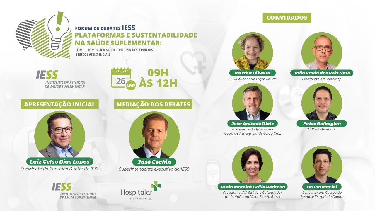 O “Fórum de Debates IESS: Plataformas e sustentabilidade na saúde suplementar: como promover a saúde e reduzir desperdícios e riscos assistenciais” reunirá exposições de casos e experiências relacionados ao tema e apresentará um debate entre os convidados.